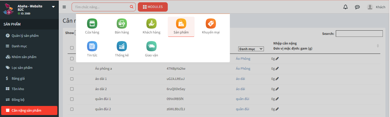 **Bước 1:** Tại trang quản trị hệ thống chọn MODUELS Sản phẩm -> Cân nặng sản phẩm