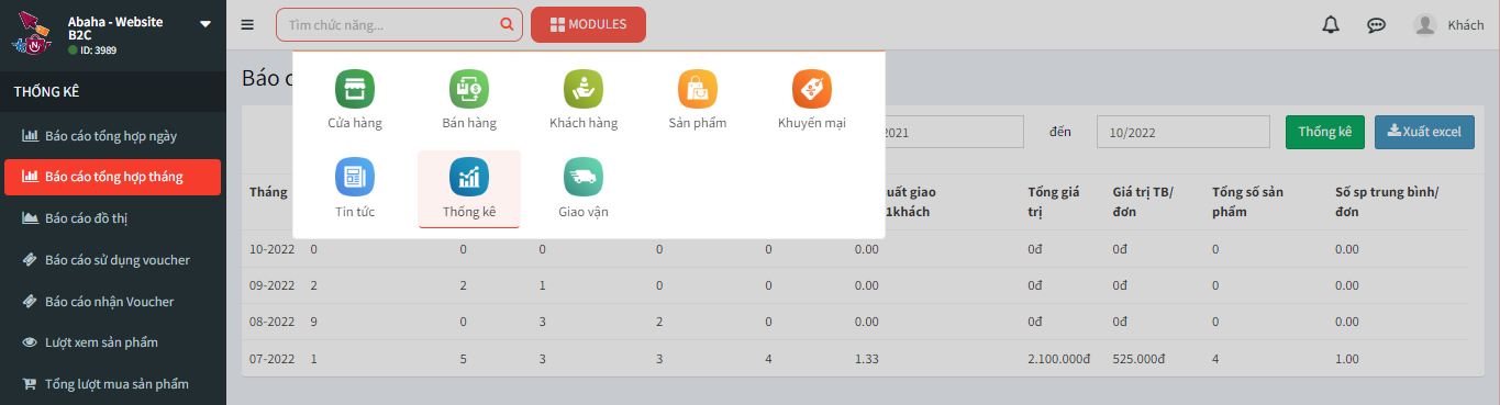 **Bước 1:** Tại màn hình trang chủ, bạn chọn MODULES Thống kê -> Báo cáo tổng hợp tháng