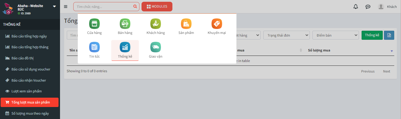**Bước 1:** Tại màn hình trang chủ hệ thống, bạn chọn MODULES Thống kê -> Tổng lượt mua sản phẩm