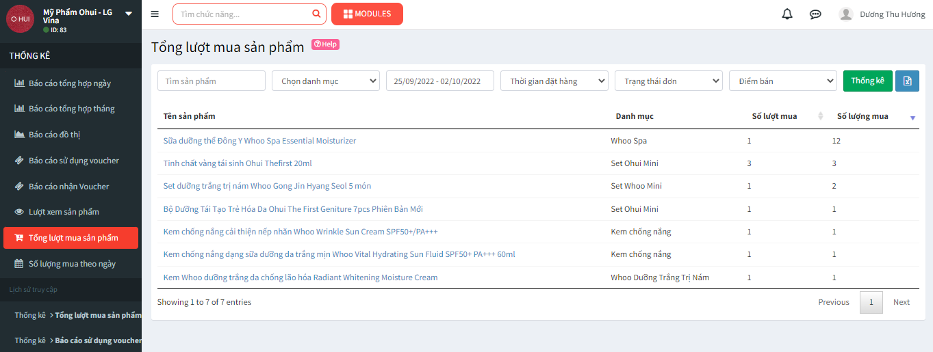 **Bước 2:** Hệ thống mở ra trang dữ liệu Tổng lượt mua sản phẩm, tại đây bạn có thể thực hiện lọc các trường dữ liệu để thống kê: