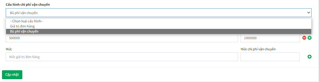**Cấu hình bù phí vận chuyển:** ứng với mỗi mức giá trị đơn hàng sẽ cấu hình mức bù phí vận chuyển tương ứng (số tiền bù phí sẽ do cửa hàng chịu).